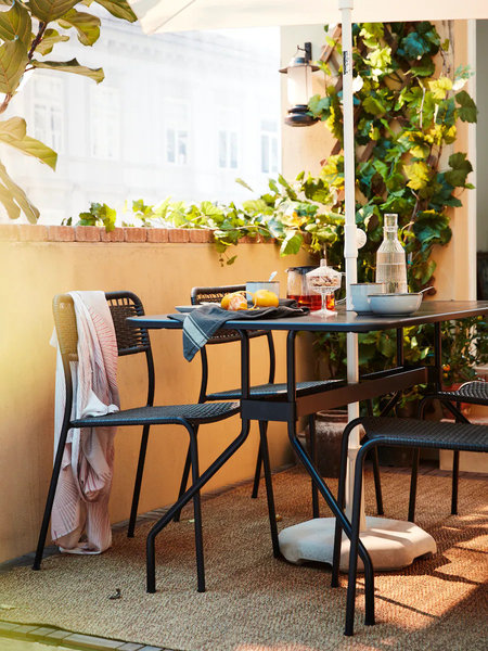 Ein Balkontisch mit praktischer Öffnung für Sonnenschirme, wie sie das VIHOLMEN-Modell bietet, sorgt für entspannte Pausen unter freiem Himmel. Mit den stapelbaren Stühlen derselben Serie kombiniert, können bis zu sechs Personen Platz nehmen.