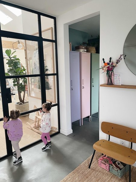 In der begehbaren Garderobe von @noi.and.me treffen pastellige Spinde in Lila, Rosa und Grün aufeinander. @-Emilie- kombiniert zur grünen Tischdecke mit weißen Punkten eine rosa Vase mit weißen Blüten.