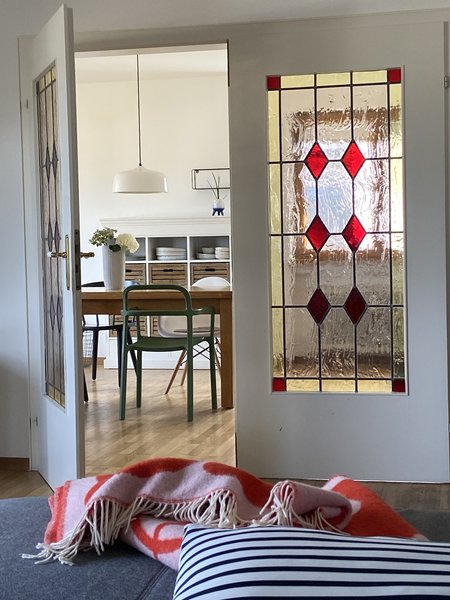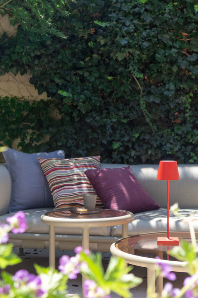 Bei [@Zilly] wird das Rot der Glasornamente in der Flügeltür bei der Wolldecke auf dem Sofa wieder aufgegriffen. Die rote Akkuleuchte von Zafferano harmoniert bei @blaupause wunderbar mit den Kissen auf dem Outdoorsofa von EMU.