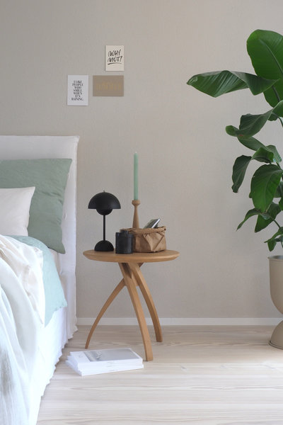 Eine Bank von Weltrevee vervollständigt nun den Vorgarten von @Natalie.D . Wer genau hinsieht, erkennt, dass es sich um eine „Schubkarrenbank“ handelt, mit der sich Natalie schon zum Meer rollen sieht. @filomena kombiniert in ihrem sommerlich leichten Schlafzimmer zur grünen Wand sanfte Beige- und Cremetöne.