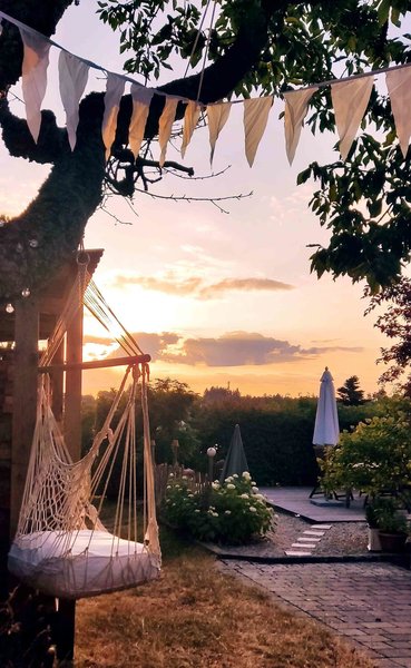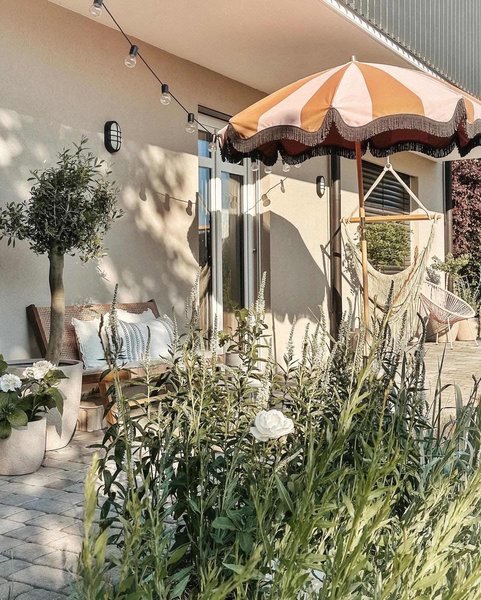 Im Schatten des Kirschbaums genießt @cessa im Hängesessel unter der Wimpelkette früh morgens das besondere Licht. @simplylifeandme lässt es sich an warmen Sommertagen auf der Terrasse unter dem Schatten spendenden Schirm von HKliving gut gehen.
