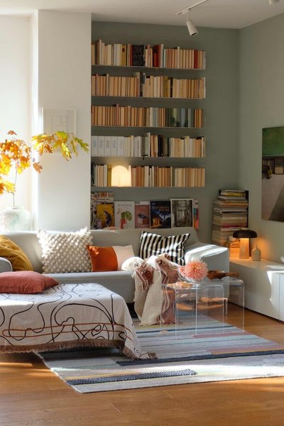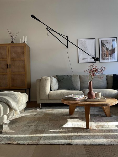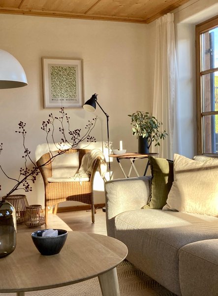 VWärmendes Novemberlicht legt sich über das in natürlichen Farben eingerichtete Wohnzimmer von @Lilalaunegarten . Herbstende: Die Blätter am Ast über der Küchenzeile von @wohnliebe_4 haben sich mittlerweile verfärbt und fallen ab.