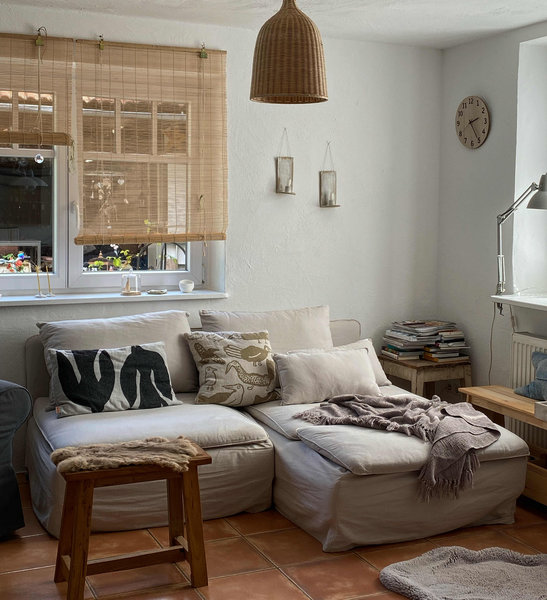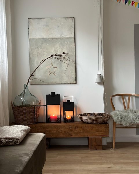 Nicht weniger einladend wirkt das SÖDERHAMN-Sofa mit Bemz-Bezug im Wohnzimmer von @Einfachheit . Unterschiedlich gemusterte Textilien sorgen für zusätzlichen Wohlfühlfaktor. @danusia hat die Holzbank mit dezenter Winterdeko in Form von Laternen und Sternanhängern umgestaltet.