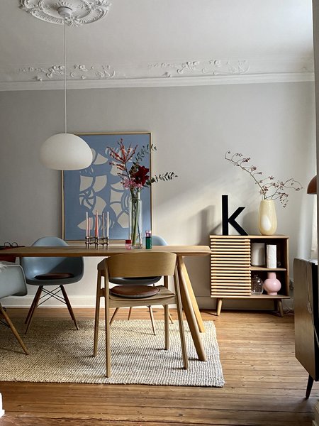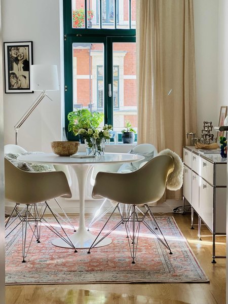 Nachdem @Mchen im Sommer ihr Haus im Grünen gegen die schöne Altbauwohnung getauscht hat, fügt sich nun alles zu einem neuen Zuhause, wie der hübsch gestaltete Essbereich mit Vitras DAR Eames Plastic Armchairs um den Saarinen-Esstisch von Knoll zeigt. Bei @120qm.happiness sind im November die letzten Kürbisse zugunsten erster Weihnachtsdeko gewichen.