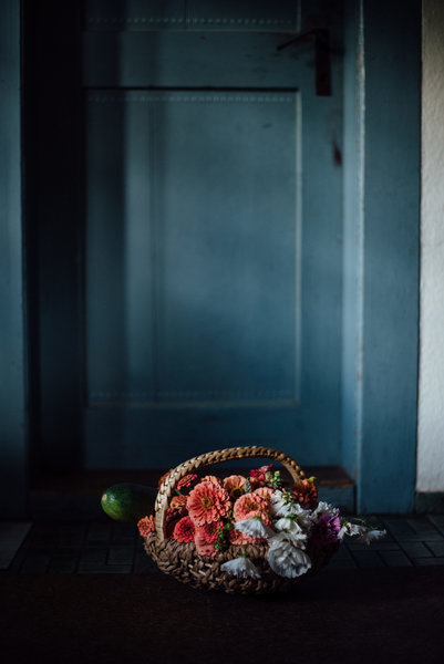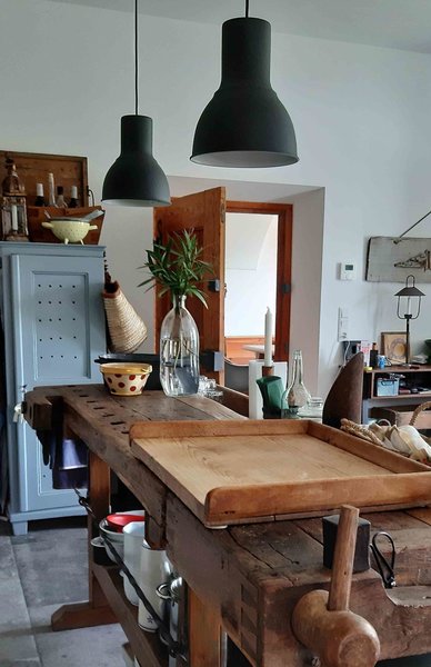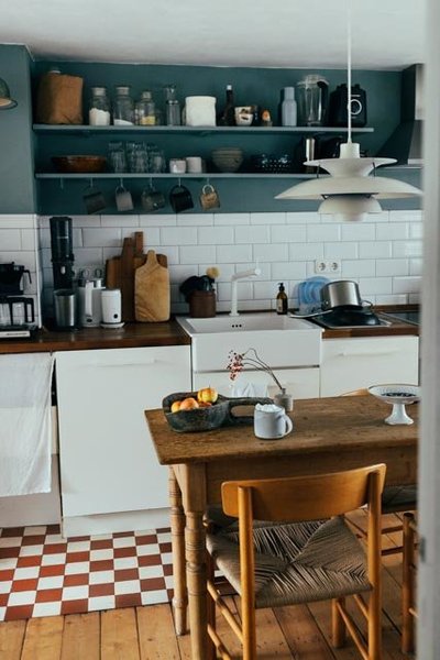 Als könnte man die Wärme und Behaglichkeit in der Küche von @borstelbü fühlen: Dielenboden und Schachbrettfliesen, der Holztisch sowie die blaue Wandfarbe lassen den wohnlichen Raum lebendig wirken. @marcia hat die letzten Blumen aus dem Garten zu einem stimmungsvollen Stillleben arrangiert.