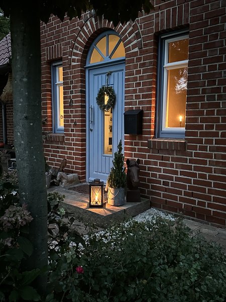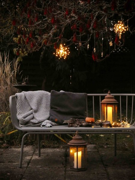 Atmosphärische Abendlichter: Laternen und Lichterketten auf der BRUSEN-Gartenbank von IKEA und in dem Essigbaum dahinter zaubern im Garten von @buchliebe im Handumdrehen weihnachtliche Stimmung. Bild im Bild: Das winterliche Poster mit der Küstenheide über dem Küchentisch ist eine eigene Fotografie von @MiMaMeise . Der Farn davor scheint direkt dem Bild entsprungen.