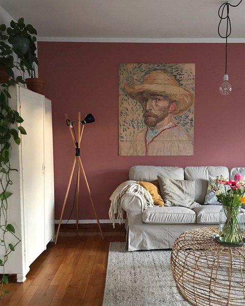 Im Wohnzimmer von @Schoene_kleine_welt hängt das Selbstbildnis von Vincent van Gogh als IXXI. Die gemusterte Tapete im Wohnzimmer von @oskarlino ziert ein farblich zum Sofa passendes IXXI mit Typografie.