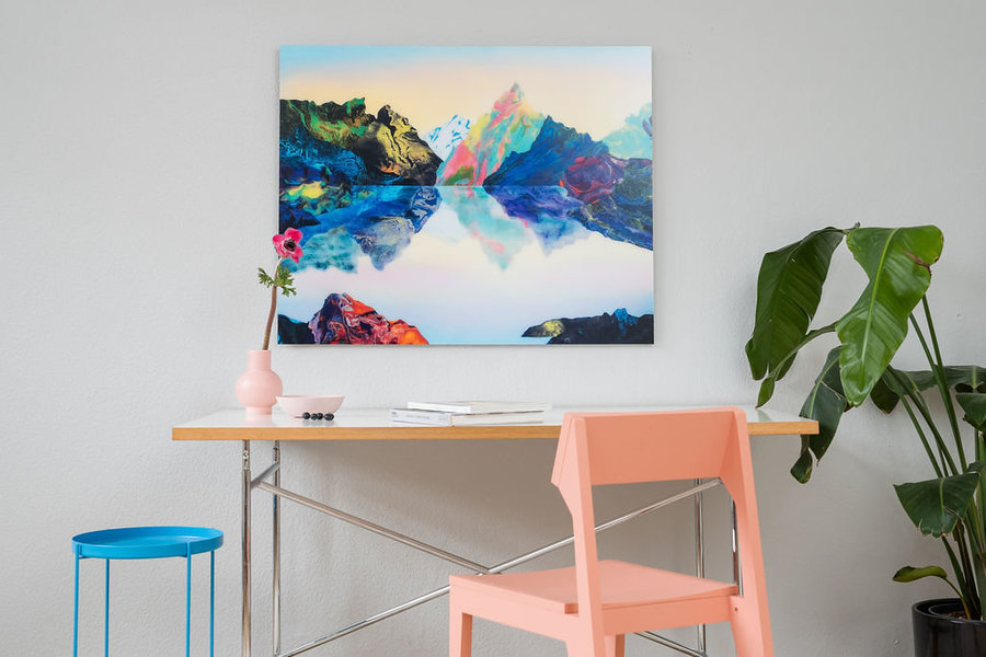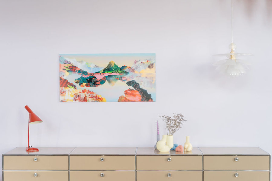 Im SoLebIch-Studio hängt das Bild in der Größe 80 x 100 cm. Psychedelisch trifft bei uns auf den geradlinigen Schulz-Stuhl von Objekte Unserer Tage und die raawii-Vase.