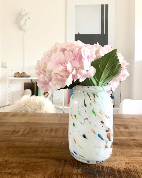 Wagenfeld trifft auf Wildblumen vom Bodensee bei @FräuleinOtten . @Petit Sourire freut sich über ihr Muttertagsgeschenk in der Bretagne: „Dieser Korb mit Blumen ist wahrscheinlich das Schönste, was ich je geschenkt bekommen habe!“ Hortensien, Eukalyptus, verschiedene Rosen und Margeriten haben ihre Kinder in der Umgebung gepflückt und für sie für diesen Tag gesammelt.