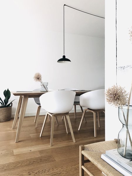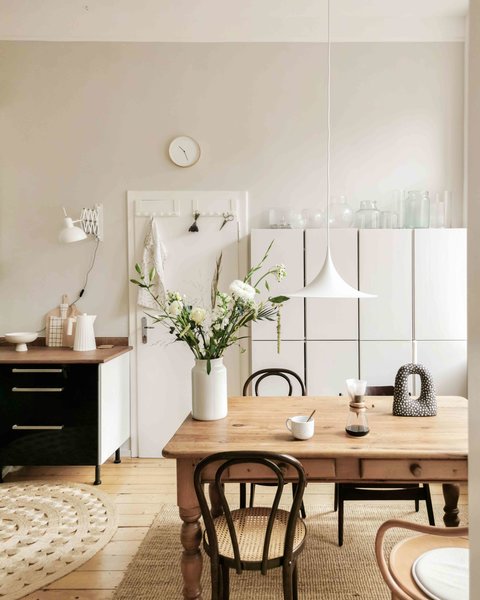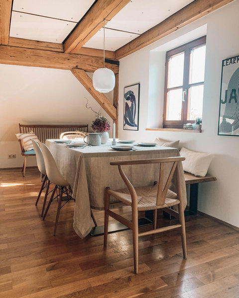 Bei @gruenderzeit_zeit ist seit September das Esszimmer mit Esstisch, Leuchte, Sideboard und Vintage-Stühlen komplett. @hyggelsi hat es sich am Esstisch mit Drink und Lesematerial gemütlich gemacht.