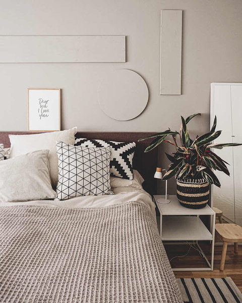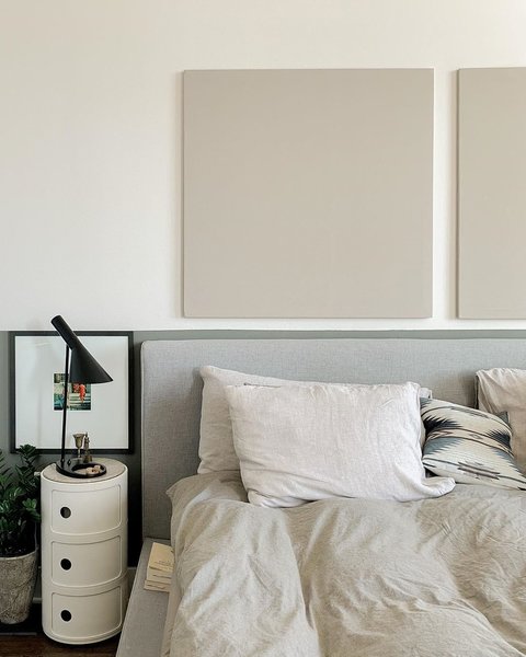 Auch wenn auf den Bildern nichts zu sehen ist, sind Bildflächen passend zur Wandfarbe eine hübsche Reliefgestaltung an der Wand. Einfache Rahmen, die mit Stoff bezogen sind, hängen bei @sophiagaleria und @Thesleeknest über dem Bett.