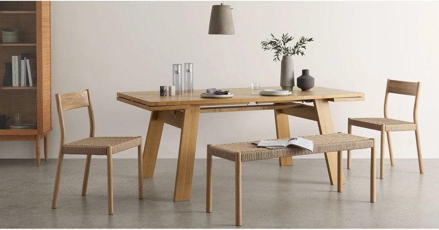 Die Rhye Esszimmerstühle aus Eiche (2 Stück für 329 €) haben eine Sitzfläche aus gewebtem Rattan. Auch eine Bank gehört zu der Kollektion.