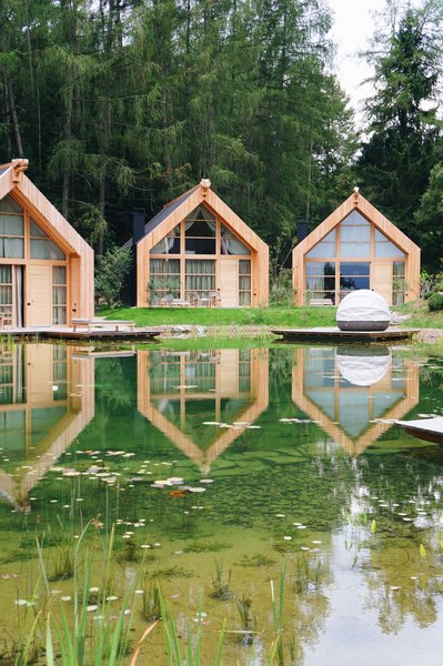 Die Idee zum Lodge-Konzept kam der Hoteliersfamilie Sanoner während eines Lodge-Aufenthalts in Afrika. Das erklärt auch die fantasievollen Holzschnitzereien und farbigen Muster. Vorlage für letztere entstammen einem Teppich, der in eben jener afrikanischen Lodge lag. Ansonsten ist die Architektur von Hugo und Alessia Demetz zurückhaltend und reduziert gestaltet.