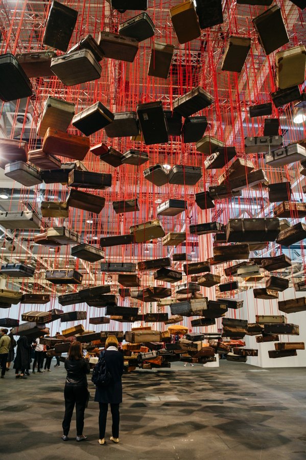 Paul McCarthys (Hauser & Wirth) "Tomato Head (Green)" Installation ging für 4,75 Mio Dollar an eine private Sammlung. Der Künstler verwendet die menschgroße Spielzeugfigur Mr. Potato Head, um die Beziehung zwischen moderner amerikanischer Kultur, Konsum und Unschuld darzustellen. Die Installation mit Dutzenden von der Decke schwebenden Koffern der Japanerin Chiharu Shiota (Galerie Daniel Templon) "Searching for Destination" wirkte auf mich beängstigend: sie weckt sofort Assoziationen von Flucht und Vertreibung. Eine der wenigen Arbeiten auf der Art, in der es um die gesellschaftliche Auseinandersetzungen ging (Bild PR).