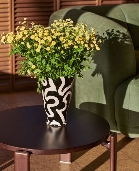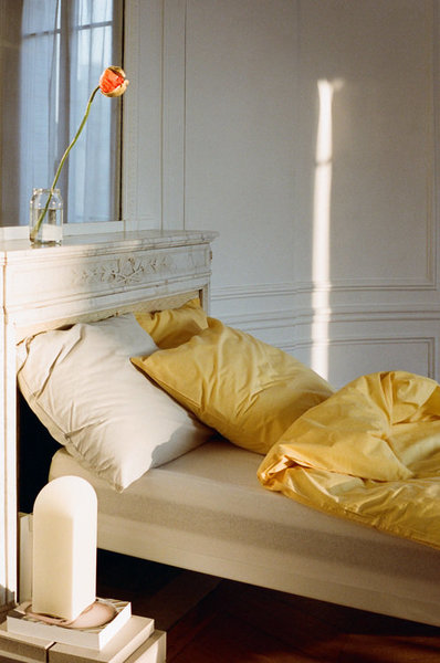 Für sonnige Träume: Duo-Bettdeckenbezug in Goldgelb (59 €) und Duo-Kissenbezug in Cappuccino (25 €). Der Beistelltisch Rey aus lackiertem Buchenholz (1.649 €) trägt einen leuchtgelben Blumenstrauß in der schwarz-weiß gemusterten Shadow-Vase von Jessica Hans (89 €).
