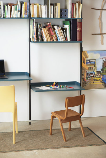 Unterschiedliche Anforderungen erfordern verschiedene Lösungen: Pier-System in Blau mit integriertem Arbeitsplatz für Groß und Klein und Pier-System in Weiß als Wohnzimmerregal.