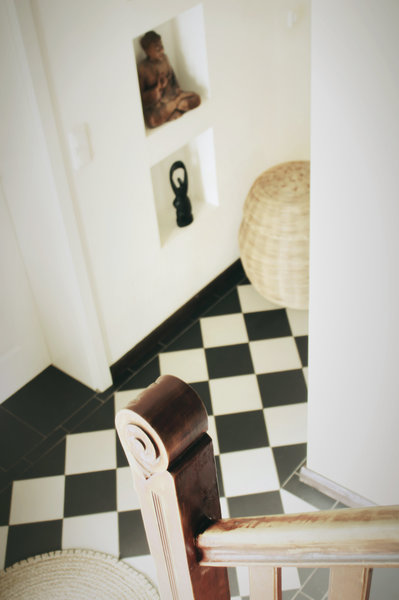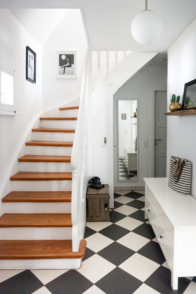 Alten Charme wieder aufleben lassen: @nathalie seel s klassisch schwarz-weißer Schachbrettboden ähnelt dem (leider unbrauchbaren) Originalboden des alten Hauses. Die geometrischen Fliesen stammen von einem italienischen Label und wurden nach der englischen Verlegetechnik mit Fries verlegt. „Sie sind mega putzintensiv, aber so schön“, findet Nathalie.