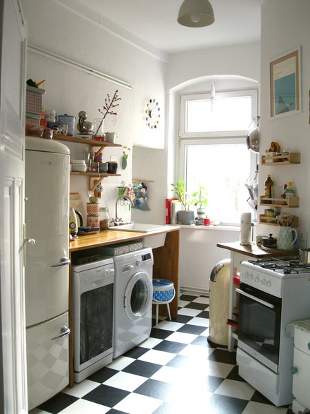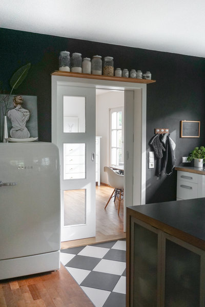 @bumblebee hill ist sehr glücklich über die Entscheidung der Vorbesitzer ihres Hauses, große Schachbrettfliesen im Flur und in der Küche zu verlegen. In Letzterer ergibt sich so ein faszinierendes Farbenspiel aus schwarzen Wänden zum schwarz-weißen Checkerboard-Boden.
