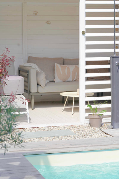 Mit dem Poolhaus hat sich @sabrinchensoest ein schattiges Plätzchen im Freien geschaffen. Durch die luftigen Lamellen vorne und an der Seite kommt trotzdem genug Sonnenlicht an. Architektonisches Highlight im Wohnzimmer von @nines ist die 60er-Jahre-Fensterzarge aus Stein.