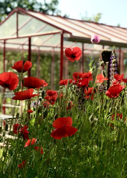 Rote Bistromöbel im Schrebergarten von @Holli1211 treffen auf blühenden Klatschmohn vor dem roten Gewächshaus von @dasFrolleinNINI .