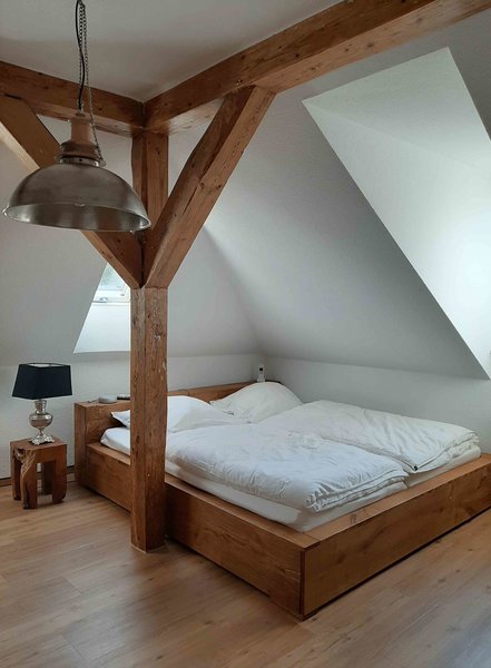 Geradlinig und unverschnörkelt: In @karlas_view s luftigem Dachgeschossschlafzimmer schläft es sich wie auf Wolken. Genau wie sie hat auch [@Jamie-Lee] ihr Bett direkt am Kniestock – also dem kurzen, geraden Wandbereich unterhalb der Dachschräge – positioniert. Der warme Holzton des Bettes harmoniert perfekt mit dem des angrenzenden Pfeilers.