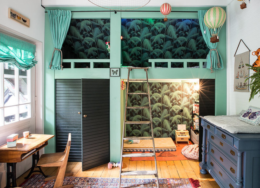Noch ein ganz besonderes Kinderzimmer: mit selbst gebautem Hochbett und Dschungeltapete bei Waldfriedenstate