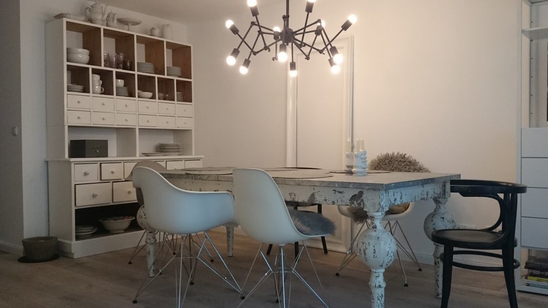 Shabby Chic und Designklassiker: Der einzigartige Essplatz von Haus Nr.7 mit tollem Stuhlmix