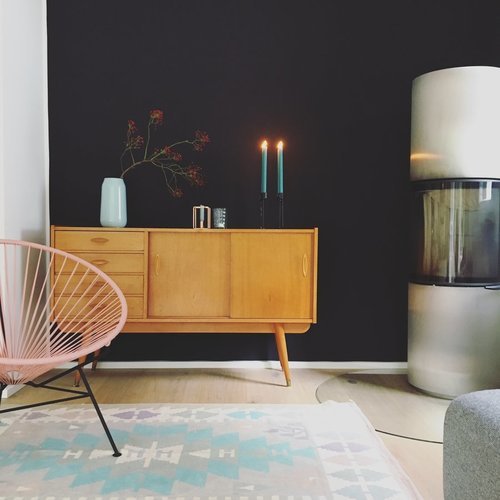 Luises Wohnzimmerwand hat einen neuen Anstrich bekommen: Der dunkle Farbton bietet jetzt eine tolle Leinwand für das Vintage Sideboard und den Kaminofen.
