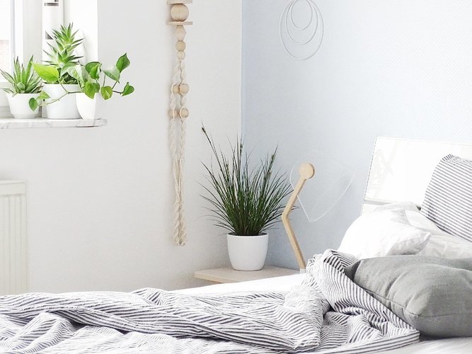 Auch im Schlafzimmer von Julia Mammilade verströhmt zartes Hellblau an der Wand Ruhe und Leichtigkeit