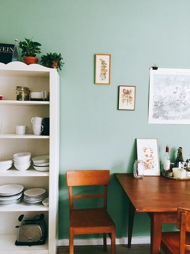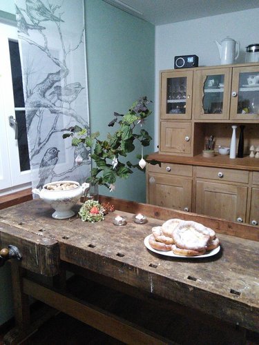 Auch zur Herbstdeko von Shilly-Shally gesellen sich dezente Farbtupfer in Blau und bei Herbi zieht eine alte Werkbank in die Küche ein, dessen Holz wunderbar mit der Wandfarbe harmoniert
