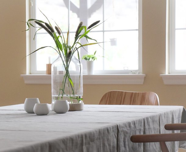 Ganz zart im Herbst: Kaddel kombiniert Holz, Leinen und Gräser für ihre Tischdeko