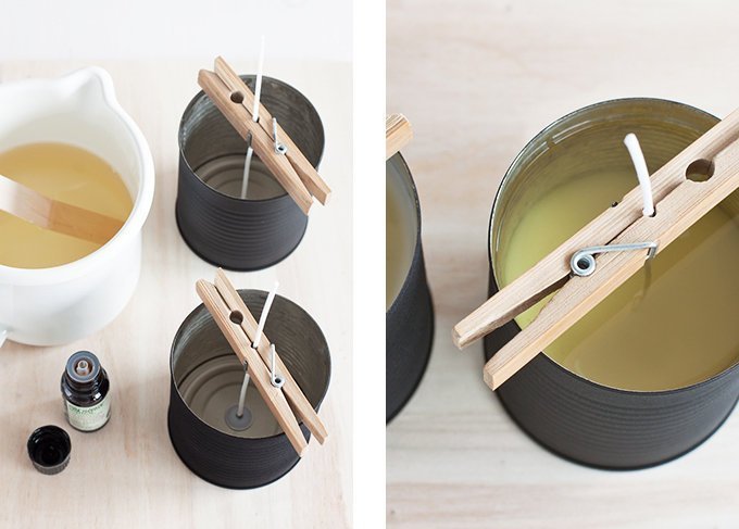 Das geschmolzene Wachs etwas abkühlen lassen. Dann ein paar Tropfen ätherisches Öl zum Wachs geben und mit einem Holzstäbchen umrühren. Das Wachs in die Dose gießen und die Dose danach möglichst nicht mehr bewegen. Das Ganze über Nacht vollständig aushärten lassen.