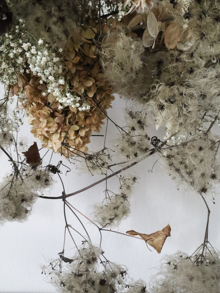- Cathrins Trockenblumen sind alle federleicht. Arbeitet man jedoch mit Tannengrün oder anderen schweren Pflanzen, ist auf eine gleichmäßige Gewichtsverteilung zu achten, da sonst die Wolke irgendwann kippt. Bei leichten Blüten passiert das nicht.