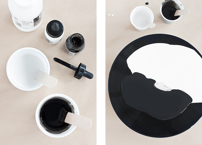 Staub und Fettrückstände von der Schallplatte entfernen. Das Loch auf der Rückseite abkleben. Gießmedium mit den gewünschten Acrylfarben anmischen. Damit die Farbe schön fließt, sollte das Gemisch eine Konsistenz von flüssigem Honig haben. Bei dicken, pastosen Farben empfiehlt es sich deshalb, etwas Wasser hinzuzufügen.