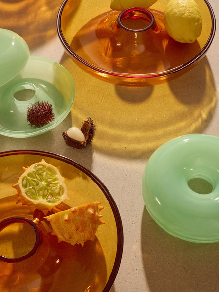 Die (leicht) transparenten Servierschüsseln mit Deckel entfalten vor allem im Zusammenspiel mit Licht ihre Wirkung: In ihrer Form erinnern die Glasgefäße an Donuts. Sie sind in Bernsteingelb (49,99 €, Ø 30 cm) und in Mintgrün (29,99 €, Ø 18 cm) erhältlich.