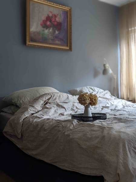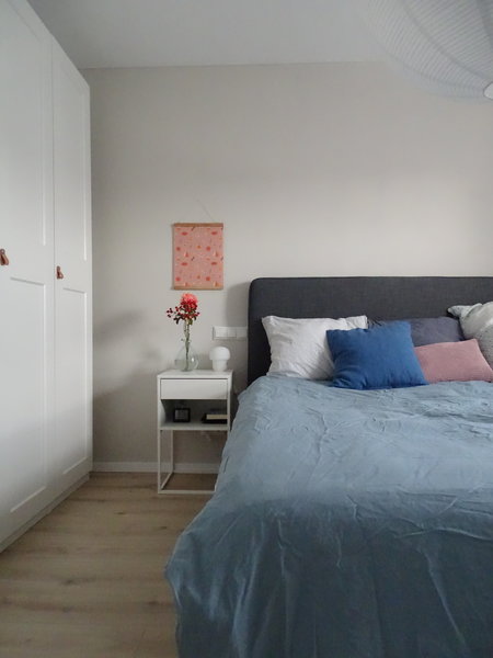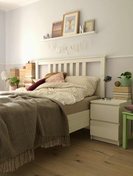 Mit dem Massivholzbett aus geölter Eiche ist @ernebart sehr zufrieden, allerdings ist die Suche nach der perfekten Matratze nach mehreren Jahren noch nicht abgeschlossen. Aktuell schläft sie auf einer harten Kapok-Matte, die gegen Rückenschmerzen hilft. @S_nature_living setzt im Schlafzimmer auf zurückhaltende Farben und natürliche Materialien. Momentan ist sie auf der Suche nach der passenden Wandgestaltung – am liebsten ein Dekoelement aus Riedgras.