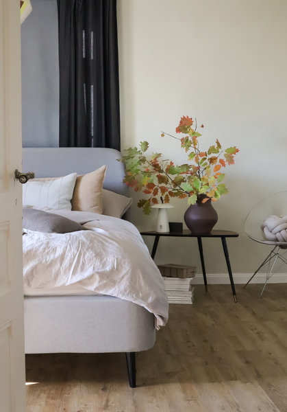Mit herbstlichen Zweigen geschmückt: @AnnCa mag ihr zeitloses Bett von MADE.com für die sanft geschwungene Form, die es sehr gemütlich macht. @aada schätzt die Ruhe ihres kleinen Schlafzimmers zum Hinterhof. Das Bett ist von IKEA und darf so lang bleiben, wie es hält.