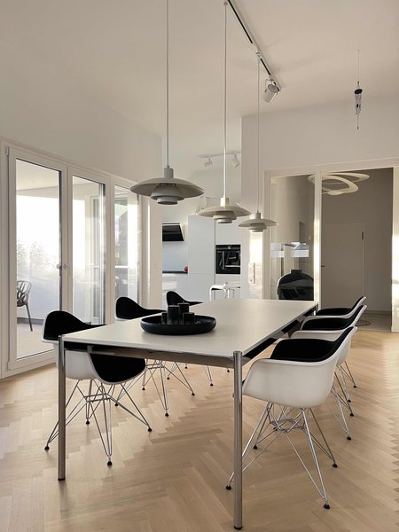 Dank eines Schienensystems von Zumtobel bleibt die Beleuchtung über dem Esstisch von [@AnkeR_flat] flexibel: Derzeit sorgen so Strahler und drei PH-4/3-Pendelleuchten von Louis Poulsen für Licht. Flos’ Arco ist bei @TheisenAy eine wandernde Bogenstehleuchte, die momentan den Esstisch erleuchtet.