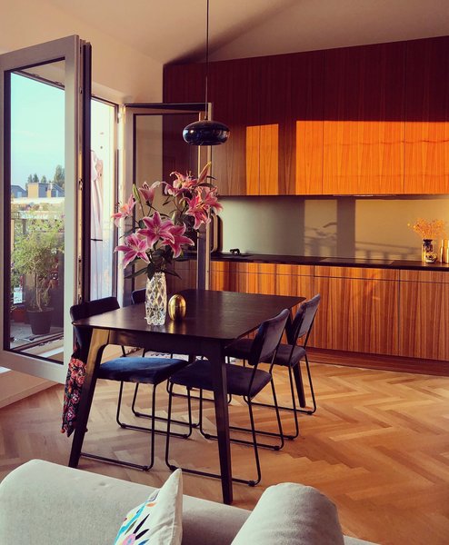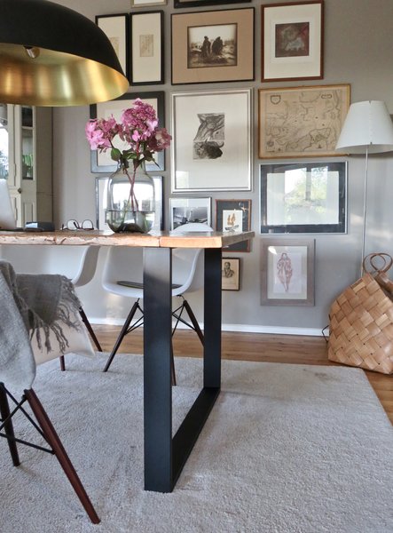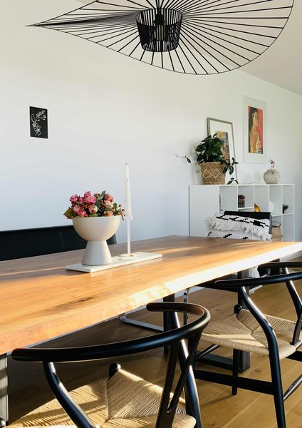@barbarella_mx hat ihren Esstisch nicht nur nach rein ästhetischen Gesichtspunkten gewählt. Nach langer Suche ist sie aber nun mit dem schwarzen Holztisch von Home24 sehr zufrieden: Aufgrund des begrenzten Platzes vor der Küchenzeile ist der Ausziehtisch in zusammengeschobenem Zustand nur 150 x 90 cm groß. Neben den filigranen, schrägen Beinen mag sie die nicht zu empfindliche Holzoberfläche. Außerdem lassen sich die Verlängerungsplatten bei Nichtbenutzung unter dem Tisch lagern, so müssen sie nicht anderweitig verstaut werden. Den 2,20 m langen Esstisch hat @1935 vor einigen Jahren nach ihren Vorstellungen mit einer 6 cm dicken Eichenplatte mit breiten Bohlen und Stahlbeinen anfertigen lassen.