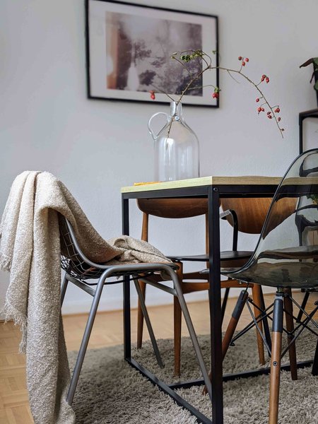 Ihren Esstisch hatte @Ho3010 vor vielen Jahren bei IKEA entdeckt und mag ihn insbesondere wegen der dünnen Tischplatte nach wie vor sehr. Das damalige Auslaufmodell war gar nicht so leicht zu bekommen – der Aufwand hat sich aber gelohnt. Ines kombiniert den Tisch mit den Master Chairs von Kartell.