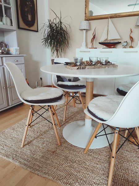 @danusia gefällt die Kombi aus Holzplatte und massiven Metallbeinen. Nicht zuletzt schätzt sie die Größe des Tisches, der 1 m breit ist und sich auf bis zu 3 m ausziehen lässt. Einmal im Monat pflegt Danuta den Tisch mit Mangoöl, dessen Duft sie liebt. @Ulla1965 ist die erste in der Runde mit einem runden Esstisch. Ulla schätzt den Kleinanzeigenfund dafür, dass er nicht zu groß und raumgreifend ist. Der Tischfuß bietet zudem maximale Beinfreiheit und die Möglichkeit, bei Bedarf einen zusätzlichen Stuhl dazuzustellen. Schönes Detail: Das Holz am Tischfuß passt zu den Stuhlbeinen.