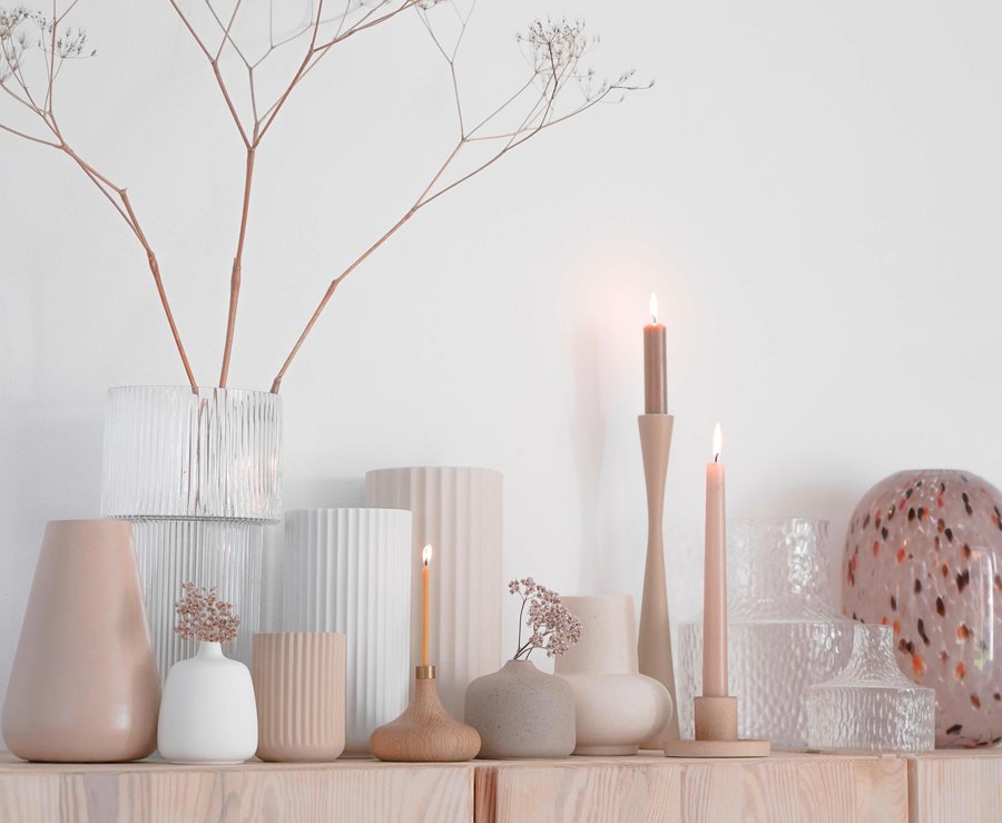 Lieblingsvasen aus Glas, Porzellan und Keramik in sanften Tönen: Die Rillenvasen, die Glasvasen Kolonn von Skruf Glassworks sowie die gefleckte Jysk-Vase sind die Lieblinge von @sabrinchensoest . Die leicht gesprenkelten Keramikvasen nutzt Sabrina gerne für getrocknete Gräser oder farbige Blümchen.
