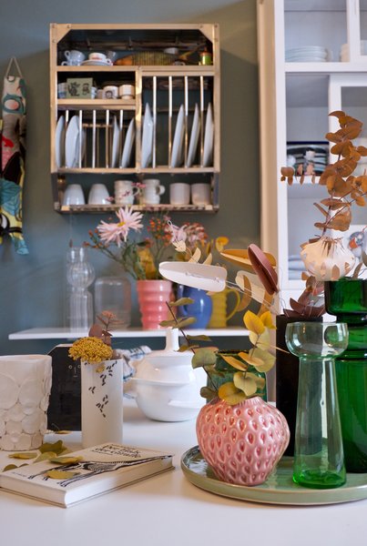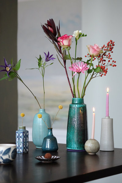 Ob bunt, weiß, gläsern, kurz, lang, dick oder dünn – @maki macht da keinen Unterschied und liebt all ihre Vasen, die eher zufällig zu ihr kommen und bei Gefallen bleiben dürfen. @gräserrauschen hat die blaue Phase (mit grünen Einschlägen) ihrer Vasensammlung mit uns geteilt. Generell sammelt Tine Vasen nach Farben: Neben weißem Biskuit, Blau und Braun haben sich auch schon etliche Glasvasen angesammelt.