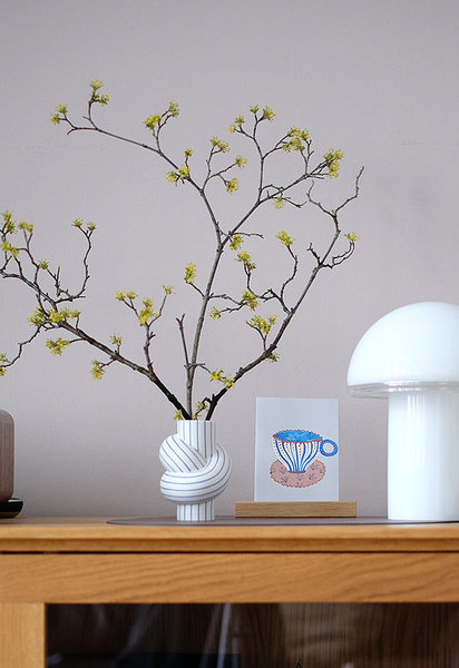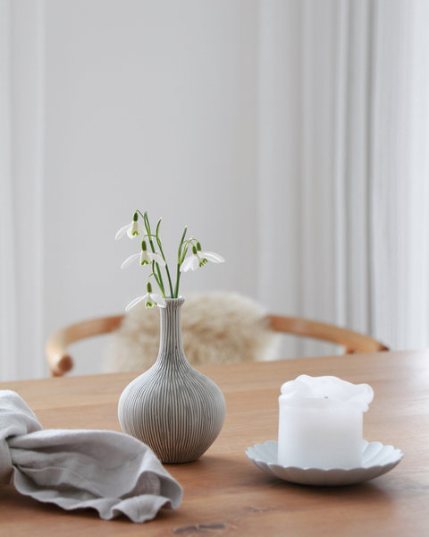 Aus der großen Anzahl an Vasen, die @HugosFrieda besitzt, haben es derzeit zwei Lieblingsstücke auf den Esstisch geschafft: Lyngby Porcelæns zeitloser Vasenklassiker in Weiß und die kleine, als Kerzenständer umfunktionierte Vase einer Keramikkünstlerin vor Ort. Auf einen „neuen Klassiker“ setzt @Christel B mit Muutos Ridge-Vase, in der die Zierquitten erblühen.