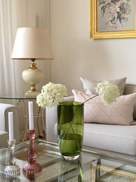 @maki s grüne Vase auf dem Tisch war eine Weihnachtsüberraschung von @Shilly-Shally . Ihren anderen Lieblingsvasen erzählt sie jedoch nicht von ihrer besonderen Zuneigung zu diesem hübschen Exemplar. In der olivgrünen Glasvase von [@beletage] kommen die weißen Annabelle-Hortensien aus dem Garten besonders gut zur Geltung.
