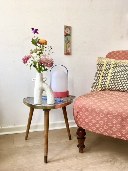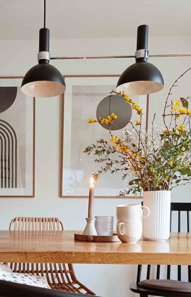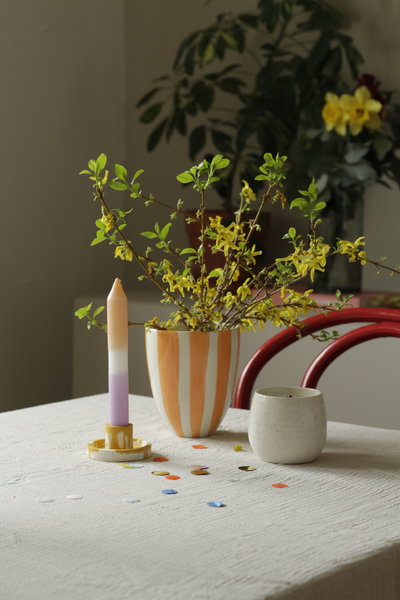 Die derzeitige Nr. 1 von @AnnCa ist die beige und braun gestreifte Vase Curlie vom schwedischen Label Byon. In der bauchig geschwungenen Form kommen die gelben Tulpen optimal zur Geltung. Die gelb-weiß gestreifte Vase hat @rosarotes.zuhause auf dem Junggesellinnenabschied einer Freundin selbst bemalt. Passend dazu hat sie einen Kerzenständer aus Keramikpulver selbst gegossen und eine Kerze in ihren Lieblingsfarben eingefärbt.