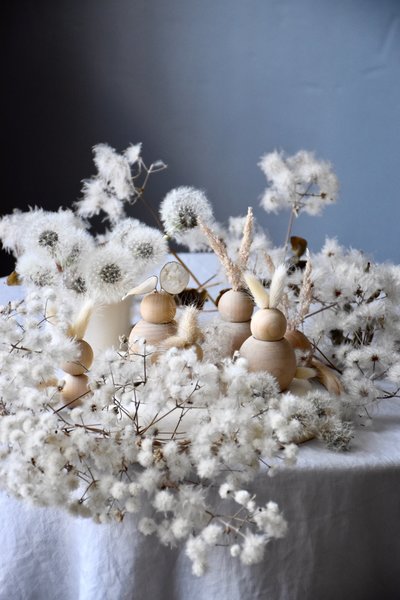 Für die Osterhasenfamilie im magischen Wald von @Petit Sourire benötigt ihr Holzkugeln, getrocknete Blumen und Heißkleber (für die Hasen) sowie Pampasgras, wilde Clematis oder Pusteblumen (für den kuscheligen Baumkranz drum herum). 3 zauberhafte DIY-Ideen für Ostern 2023 hat Arminka übrigens hier für uns zusammengefasst. @AnnCa setzt das pastellige Geschirr einer guten Freundin unter einem prachtvollen Frühlingsblumenkranz in Szene.