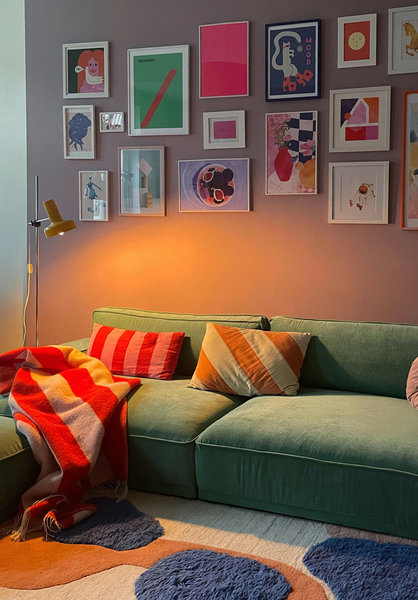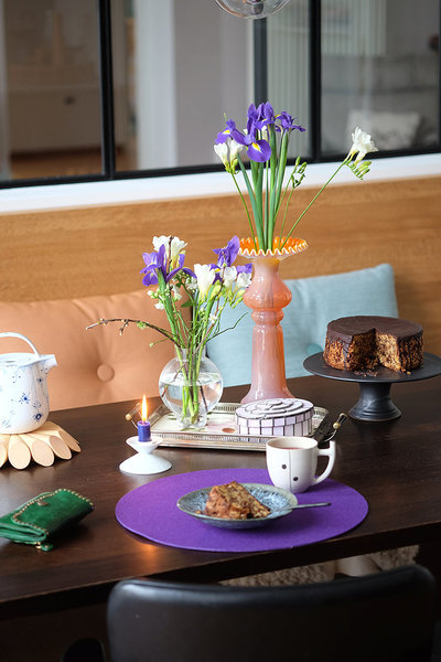 Selten „maximalistisch“ für @ernebart : Zu kräftigen Lilatönen kombiniert sie zart pastelliges Opalglas. Iris (auch bekannt als Schwertlilien) und Freesien ergänzen das Tischarrangement. Im Wohnzimmer von @missschneider trifft ein gemütlicher Farben- und Mustermix auf eine bunte Bilderwand.