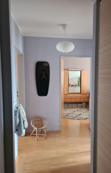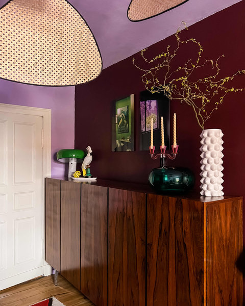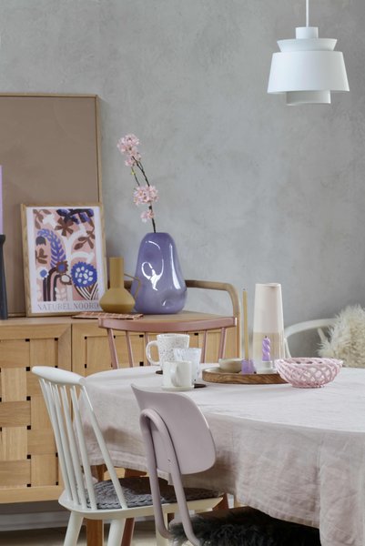 Farb-Match bei @FrauVonUndSu : Die organisch geformte Vase von H&M Home greift die Farben des Posters sowie der gedrehten Stabkerzen auf dem Esstisch auf. Pastellige Rosatöne ergänzen die Deko. Nach vier Jahren mit einem grünen Flur hat sich @janina.ve dazu entschieden, den Eingangsbereich nun in Flieder zu hüllen.