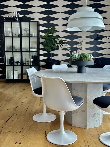Mit farbenfrohen Elementen wie dem gelben Ameisen-Stuhl, der karierten Tapete und der Wanduhrensammlung versprüht die Küche von @colourior 50er- und 60er-Jahre-Vibes. @Maisonpourcinq hat im März zum ersten Mal tapeziert: Sie hat sich für eine Tapete mit Bäumchenmotiv im Kinderzimmer entschieden, die super mit den Holzelementen harmoniert.